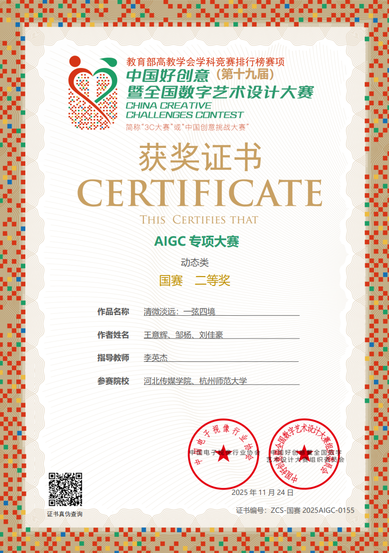 中国好创意暨全国数字艺术设计大赛(China creative challenges contest)是入选教育部中国高等教育学会发布的《全国普通高校学科竞赛分析报告》赛项。作品《清微淡远:一弦四境》以东方美学为精神内核,通过AI动态视觉技术,构建出“弦外之意、韵中有境”的四重意境空间,生动诠释了传统文化在数字时代的创造性转化。该作品在立意深度、技术实现与艺术表现上均获得评审专家高度认可,展现出美术与设计学院学子扎实的专业素养与开阔的跨媒介创作能力。