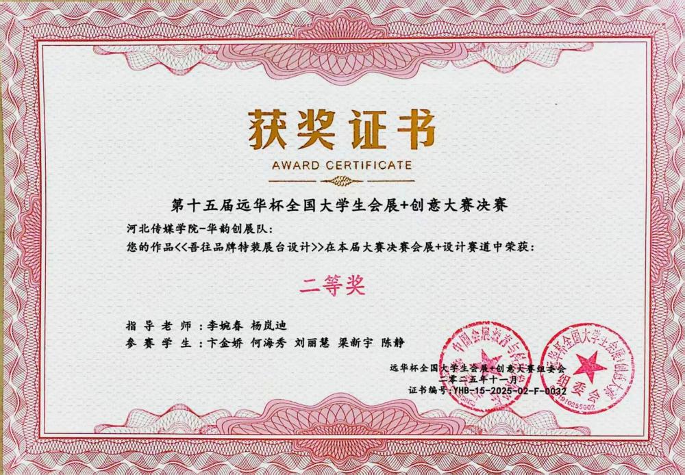11月7日至9日,第十五届“远华杯”全国大学生会展+创意大赛决赛在广州清远成功举办。作为全国会展专业领域极具影响力的赛事,本届大赛吸引了来自全国87所高校的464支队伍同台竞技,并最终筛选出113支队伍晋级决赛。我校学生凭借出色的综合表现在决赛中斩获多项荣誉:河北传媒学院获教学成果一等奖,“新星之火队”《首届河北文化旅游博览会》、“星河队”《第二十三届中国玩具展》摘得一等奖,其余队伍斩获二等奖5项。